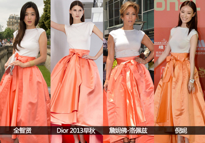 《來(lái)自星星的你》可稱(chēng)為韓劇里程碑式的劇目,全智賢因?yàn)榍ы炓吝@一角色人氣倍增,并成為眾多粉絲、乃至明星們穿衣打扮的模仿對(duì)象。來(lái)看看都有哪些人不怕在“風(fēng)口浪尖”被比較,搶著與“二千”撞衫吧! Chloe 2014春夏白色西裝撞衫。當(dāng)?shù)貢r(shí)間2014年3月21日,韓國(guó)首爾,全智賢現(xiàn)身仁川機(jī)場(chǎng);當(dāng)?shù)貢r(shí)間2014年3月2日,法國(guó)巴黎,秦嵐在2014秋冬巴黎時(shí)裝周;2014年3月25日,四川成都,高圓圓出席Roger Vivier品牌活動(dòng)。 Christian Dior藍(lán)色露臍上衣撞衫。當(dāng)?shù)貢r(shí)間2014年3月20日,韓國(guó)首爾,全智賢為韓國(guó)版《Bazaar》拍攝寫(xiě)真大片;俄羅斯版《Tatler》雜志時(shí)裝總監(jiān)Anya Ziourova 2014秋冬巴黎時(shí)裝周街拍。 Gucci 2014早春度假裙裝撞衫。全智賢《來(lái)自星星的你》劇照;當(dāng)?shù)貢r(shí)間2014年3月,洛杉磯,布萊克-萊弗利(Blake Lively)在新劇的拍攝現(xiàn)場(chǎng)。 ![]() Christian Dior 2013早秋禮服撞衫。這是“二千成名”之前的撞衫,女星們的眼光還是很統(tǒng)一的。當(dāng)?shù)貢r(shí)間2013年7月1日,法國(guó)巴黎,全智賢出席2013秋冬巴黎高定時(shí)裝周,白色與橘色的鮮艷搭配讓人眼前一亮,傘裙的設(shè)計(jì)更具復(fù)古風(fēng)情,裙擺前短后長(zhǎng)更是當(dāng)下流行;當(dāng)?shù)貢r(shí)間2013年6月20日,美國(guó)洛杉磯,詹妮佛-洛佩茲(Jennifer Lopez)留名星光大道儀式;2013年6月15日,上海,倪妮亮相第16屆上海國(guó)際電影節(jié)開(kāi)幕紅毯。 ![]() Louis Vuitton 2014早秋斗篷撞衫。全智賢《來(lái)自星星的你》劇照;2014年2月,米蘭時(shí)尚博主Chiara Ferragni 2014秋冬紐約時(shí)裝周街拍。
