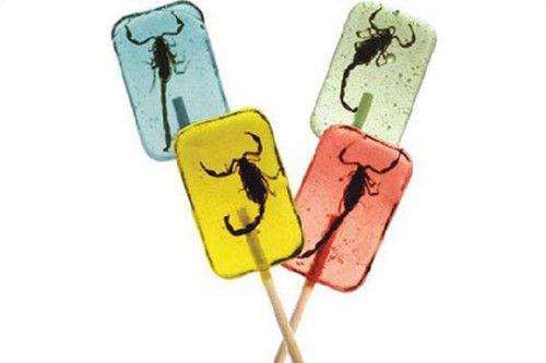 這些無(wú)害的加利福尼亞的蝎子被裹在糖衣里面,相關(guān)數(shù)據(jù)表明,在世界很多地方,蝎子是一種主食,所以吮吸蝎子棒棒糖沒(méi)什么可大驚小怪的。