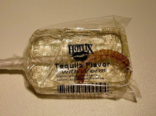 現(xiàn)在你可以盡情享用龍舌蘭酒而不用擔(dān)心赤身裸體和魯莽的行為。只要吮吸一根沒(méi)有糖衣的龍舌蘭酒味的棒棒糖,連同一個(gè)可食用的幼蟲包裹在里面。
