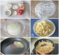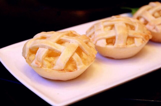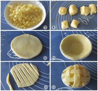 ![]() 用料: 低筋面粉 150克 黃油 70克(60克+10克) 細(xì)砂糖 55克(15克+40克) 水 68克(48克+20克) 蘋(píng)果 300克 檸檬汁 1小勺 鹽 少許 玉米淀粉 10克 蛋液 少許 小小蘋(píng)果派的做法: 1、準(zhǔn)備好所需材料。 2、60克黃油室溫軟化后加入低筋面粉和15克細(xì)砂糖,用手揉勻。 3、加入48克水,揉成面團(tuán)。 4、蘋(píng)果去皮切丁備用 5、炒鍋放入10克黃油 6、放入切好的蘋(píng)果丁翻炒,加入淀粉、鹽、檸檬汁以及剩下的糖(40克)和水(20克)翻炒。 ![]() 7、炒至餡料變得濃稠后出鍋備用。 8、將面團(tuán)等分成6大分,每一份再按2:1的比例分成2分。 9、取較大的面團(tuán)(比例為2的面團(tuán)),用搟面杖搟成薄片。 10、用手輕壓派皮,使派皮緊貼在模具上,移去多余的派皮,并用牙簽在派皮底上叉一些小孔。 11、取小面團(tuán)(比例為1的小面團(tuán)),用搟面杖搟成薄片,切成小長(zhǎng)條。 ![]() 12、在派皮盞里填入蘋(píng)果餡,將切好的長(zhǎng)條在盞表面交叉編成網(wǎng)格。表面刷上蛋液。預(yù)熱烤箱。先以200度烤15分鐘,再將溫度調(diào)至175度烤25分鐘,烤到表面微金黃色即可出爐。 ![]() |