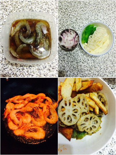 1、蝦洗凈挑線,料酒腌20分鐘。